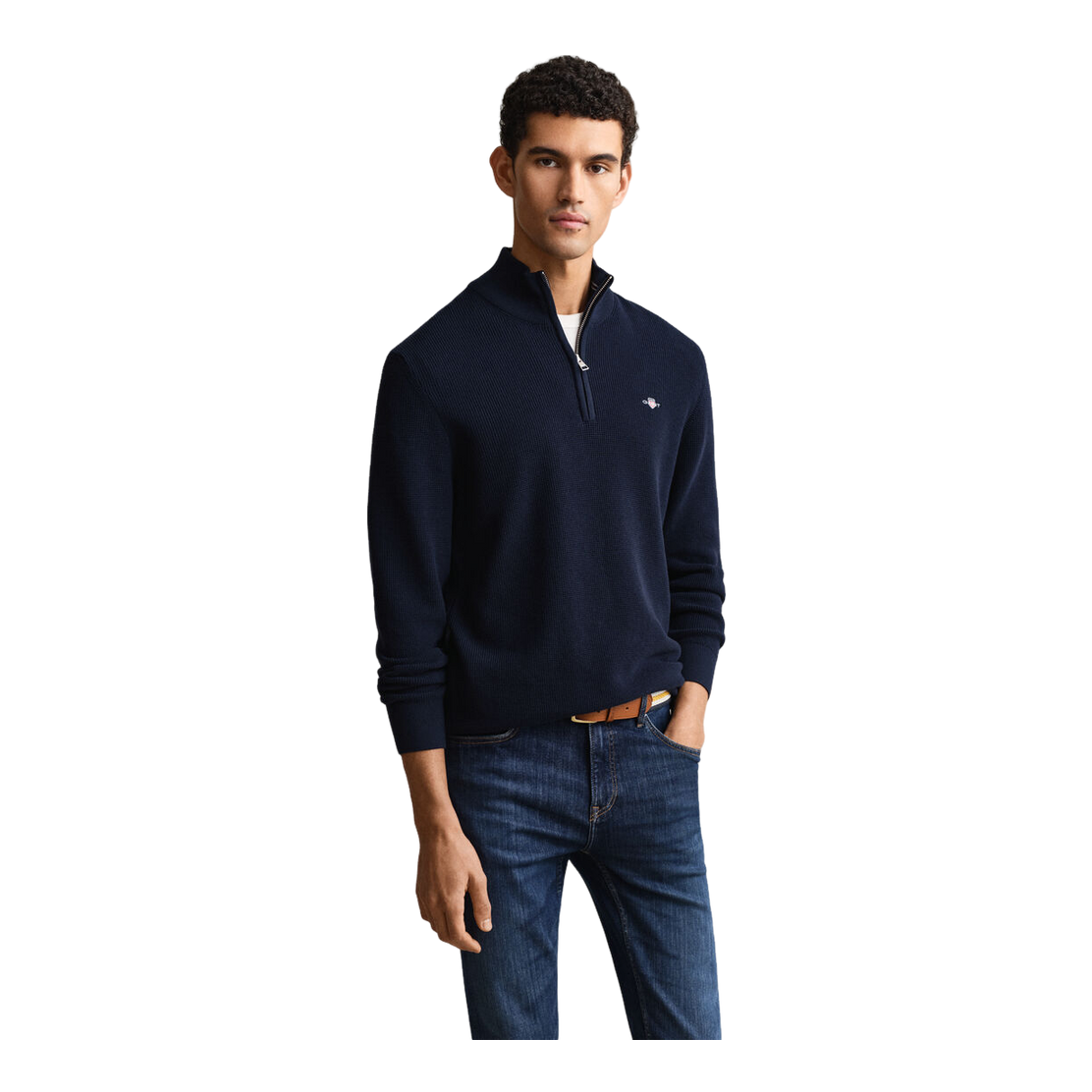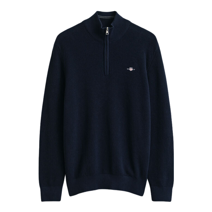 Elevate your wardrobe with the GANT Micro Textured Cotton 1/4 Zip. This regular fit knitwear features ribbing at the collar, cuffs, and hem for added comfort, along with a small waffle texture that adds depth. The stylish shield embroidery on the chest reflects quality craftsmanship. Ideal for casual outings or relaxed weekends, this versatile piece can be easily worn over chinos or jeans for a laid-back yet refined look.